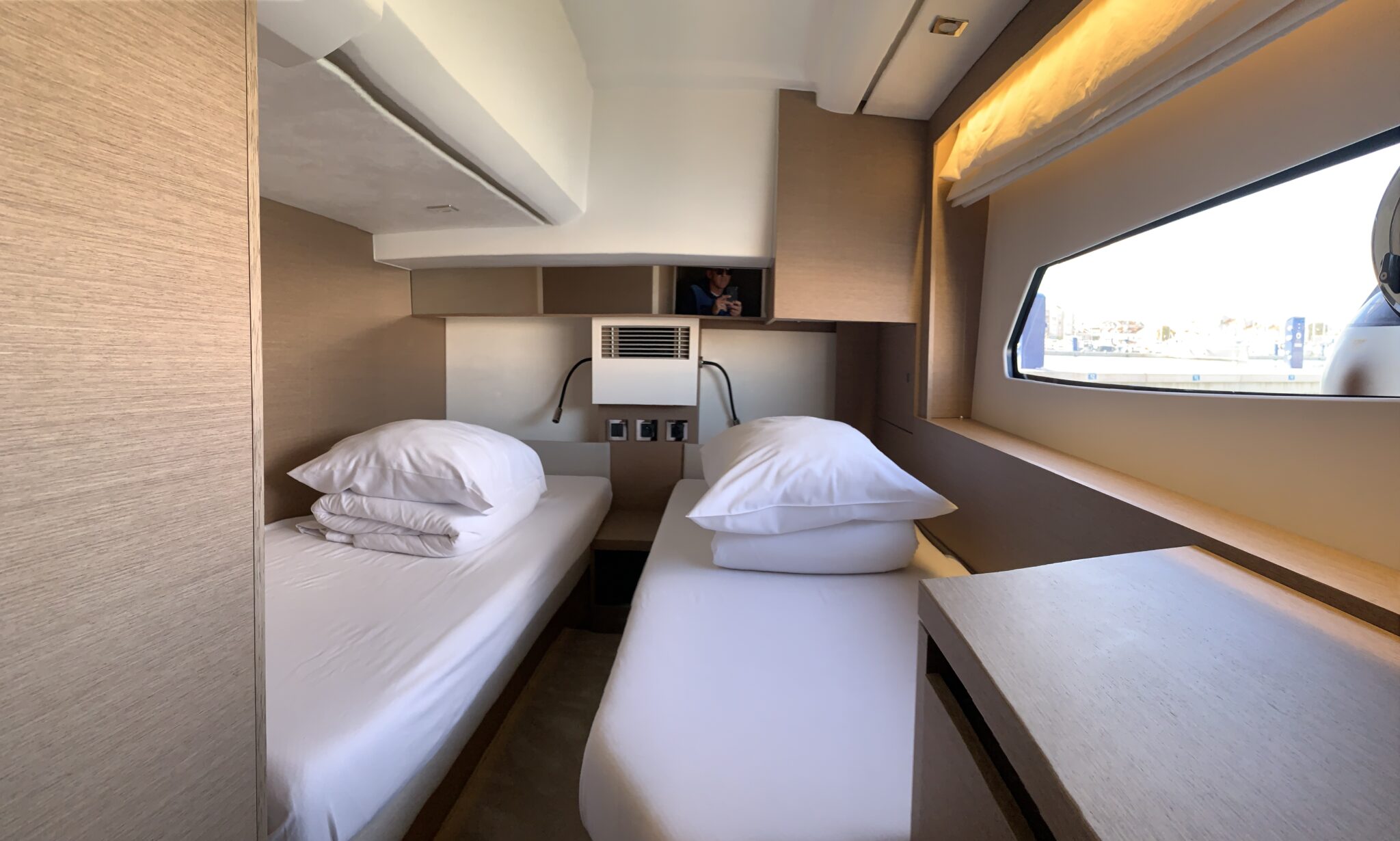 The interior features two cabins, two bathrooms, a fully equipped kitchen, and a panoramic salon. The flybridge adds extra space for sunbathing, dining, and enjoying the view from above. The entire yacht is air-conditioned, with a spacious swim platform at the stern.