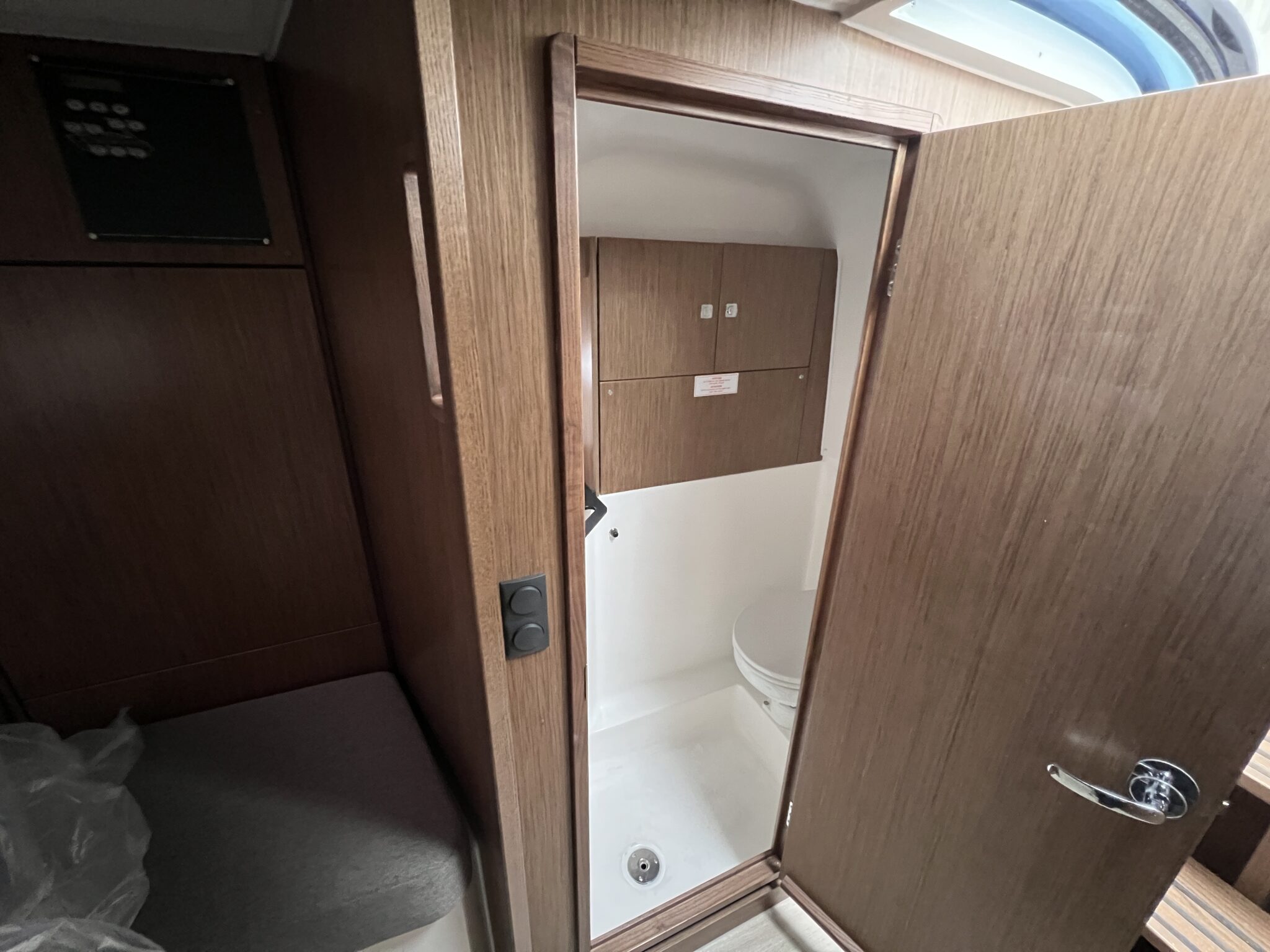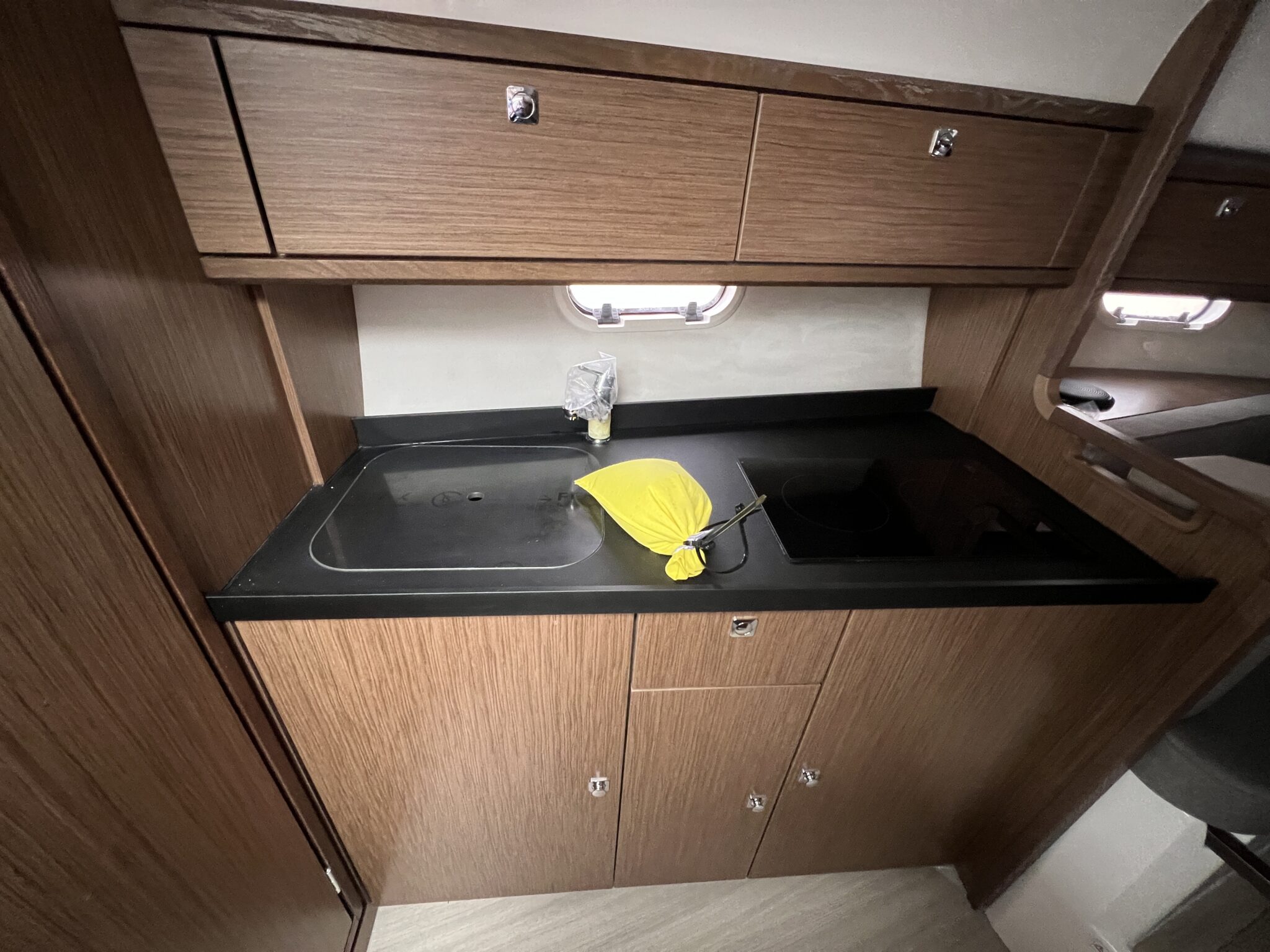 Fully equipped galley with fridge, ceramic hob, and stainless steel sink. Bathroom includes an electric toilet and shower.